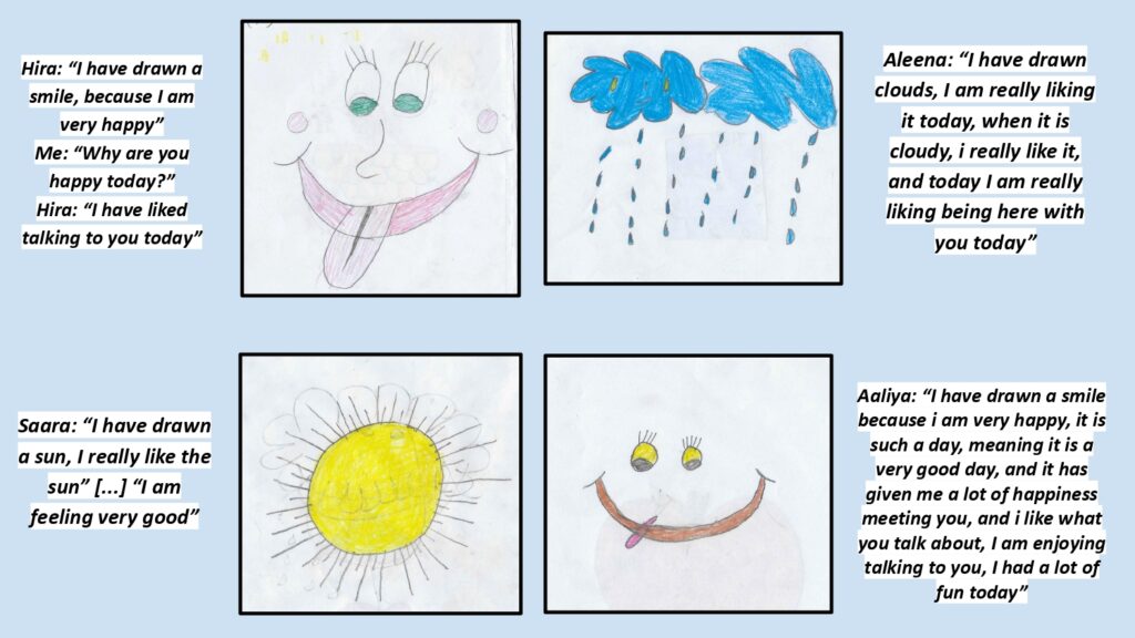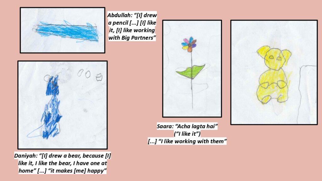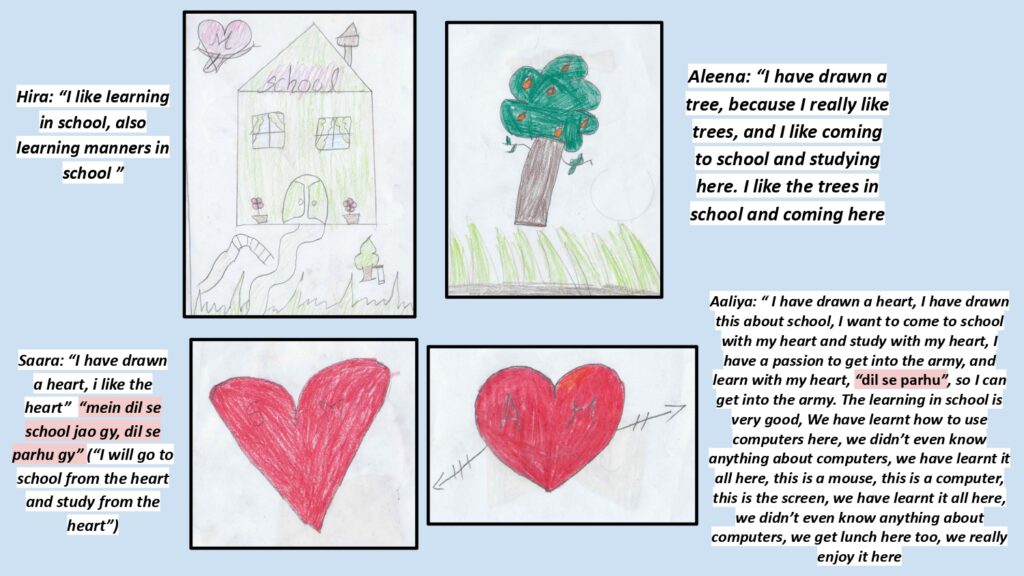 My fieldwork focused on the Sikho Sikhao Saathi (Partners in Learning) project, designed by Cities for Children and delivered through community learning centres and a school run by ‘Junior Jinnah Trust’ – a non-profit organisation focused on making quality education accessible for marginalised and unprivileged children in Pakistan. Over the course of a month, I observed sessions, held interviews and group discussions with the children and teaching staff, and facilitated a creative Draw and Tell activity with the Big and Little Partners. I wanted to explore how the children experienced their roles and how this shaped their relationships, sense of agency, views on education and imagined futures.