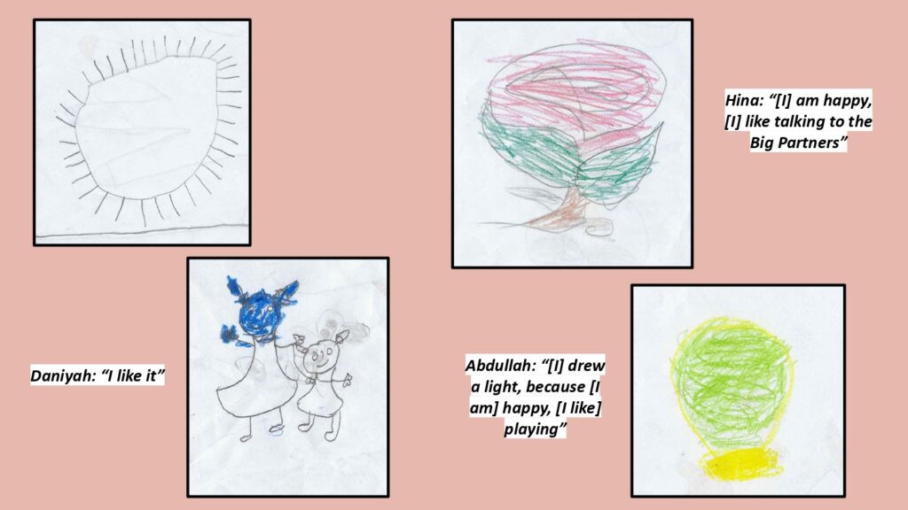 Teacher: “At the start of the programme, [the Little Partners] would not talk to [the Big Partners], they would not even share their names, they would be crying, we would be bringing them as in whilst they would be crying, now thank God, they come happily themselves, even when we see them on our way to school, they themselves say “hello ma’am, asalaamualaikum”, “are we coming on Friday?””